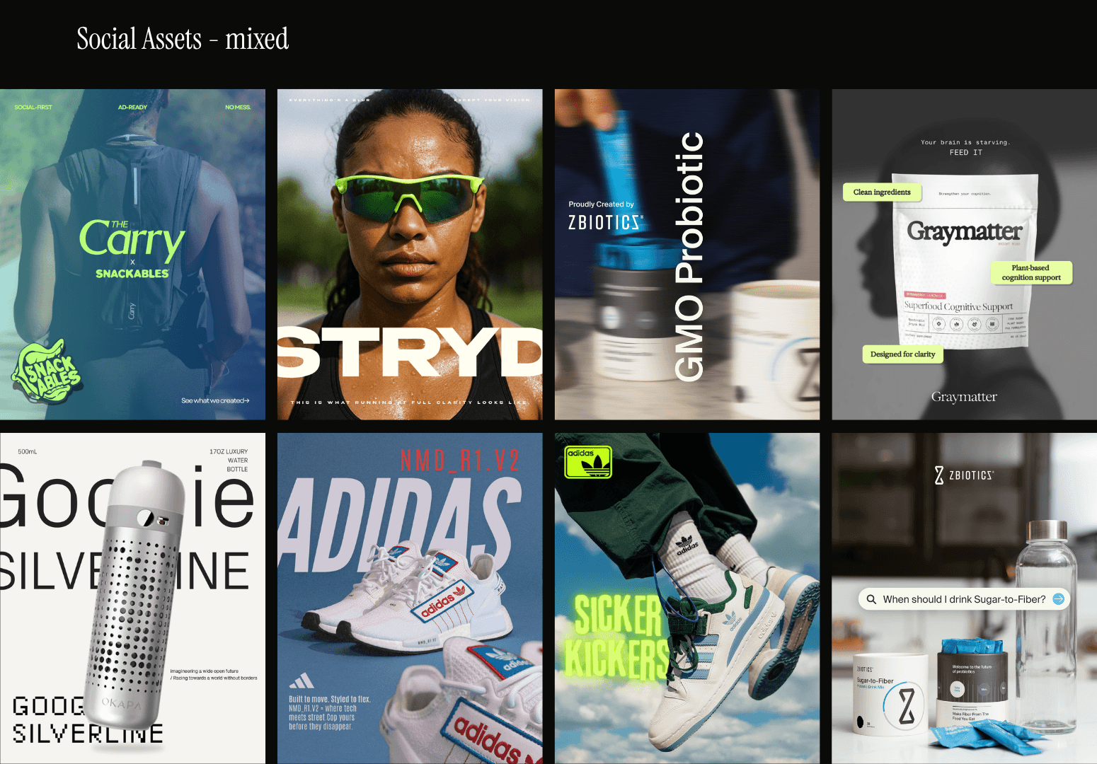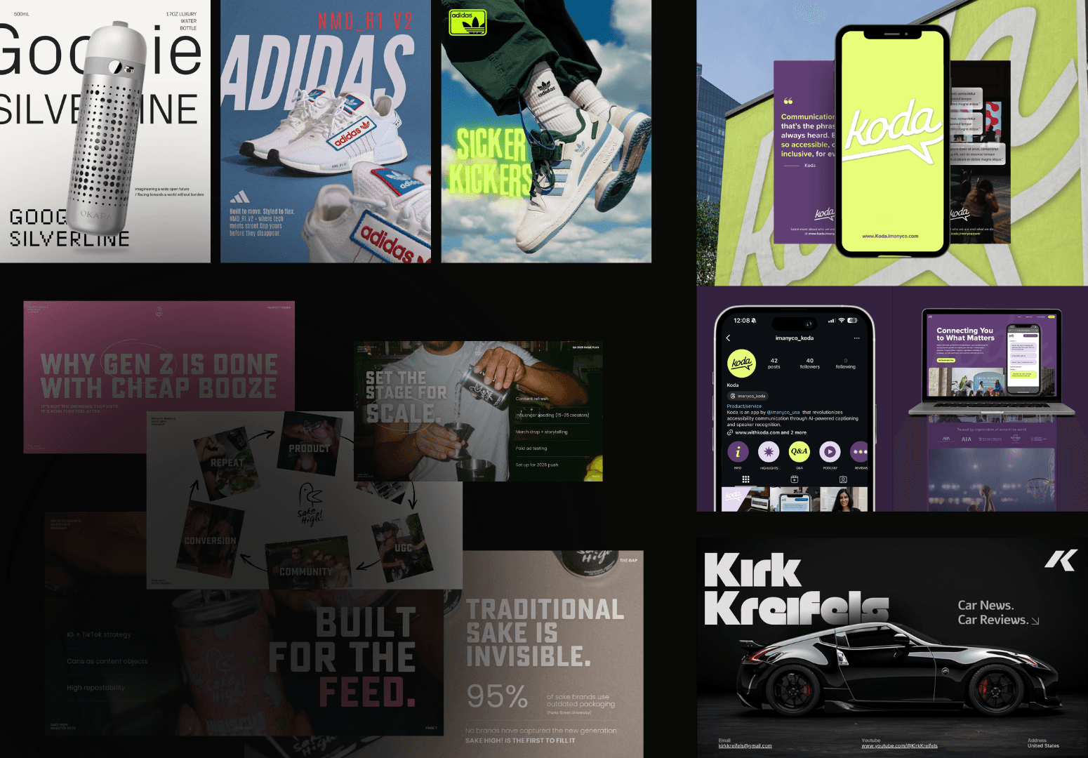 A curated collection of digital design work across multiple clients, exploring a range of styles, formats, and visual approaches. Highlighting versatility in design, creating visuals, exploring strong typography and layout, as well as digital storytelling.
